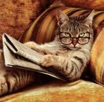 De afbeelding toont een lieflijke kat die comfortabel zit met een krant in zijn pootjes, terwijl hij zich verdiept in het nieuws van de dag. Bewonder de rustige uitstraling van de kat en de gedetailleerde weergave van de krant.